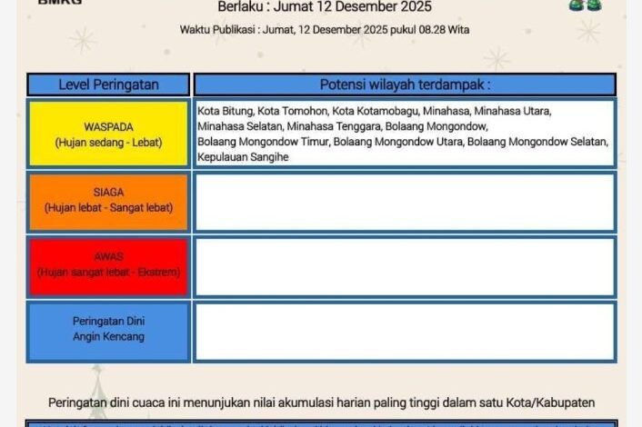 FORUMADIL, Manado — Badan Meteorologi, Klimatologi, dan Geofisika (BMKG) mengeluarkan peringatan dini cuaca ekstrem di sejumlah wilayah Sulawesi Utara. Potensi hujan dengan intensitas sedang hingga lebat yang disertai angin kencang dan petir diperkirakan terjadi pada periode 11–14 Desember 2025.