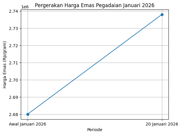 Grafik menunjukkan tren kenaikan harga emas Pegadaian sepanjang Januari 2026, dari kisaran Rp2.680.000 per gram pada awal Januari menjadi Rp2.738.000 per gram per 20 Januari 2026. Kenaikan ini menegaskan penguatan minat pasar terhadap emas sebagai instrumen lindung nilai.