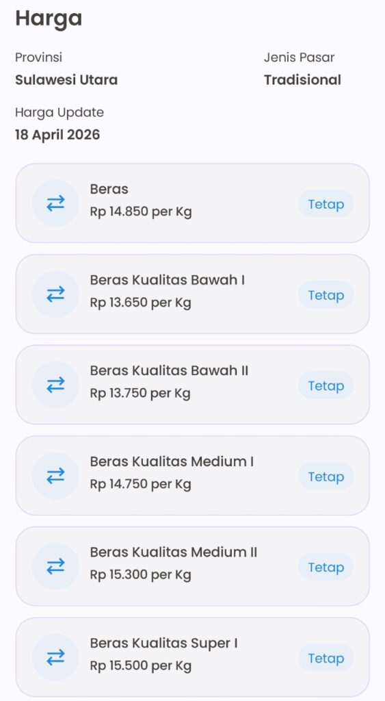 Pada 18 April 2026, harga beras di pasar tradisional Sulawesi Utara terpantau stabil. Beras kualitas bawah I Rp13.650/kg, bawah II Rp13.750/kg, medium I Rp14.750/kg, medium II Rp15.300/kg, super I Rp15.500/kg, dan super II Rp15.400/kg. Data ini bersumber dari pemantauan resmi pasar tradisional provinsi.