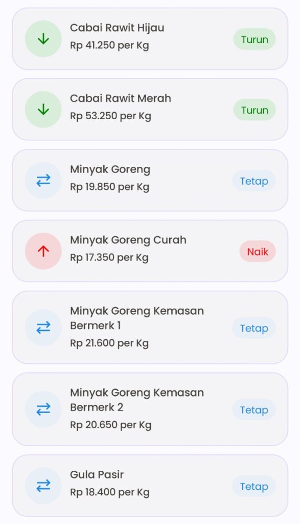 per 18 April 2026, bawang merah (termasuk ukuran sedang) turun ke Rp49.400/kg, bawang putih stabil di Rp42.500/kg, cabai merah dan cabai merah keriting turun menjadi Rp35.000/kg, serta cabai rawit Rp49.800/kg. Tren penurunan ini memberikan sedikit keringanan bagi konsumen.